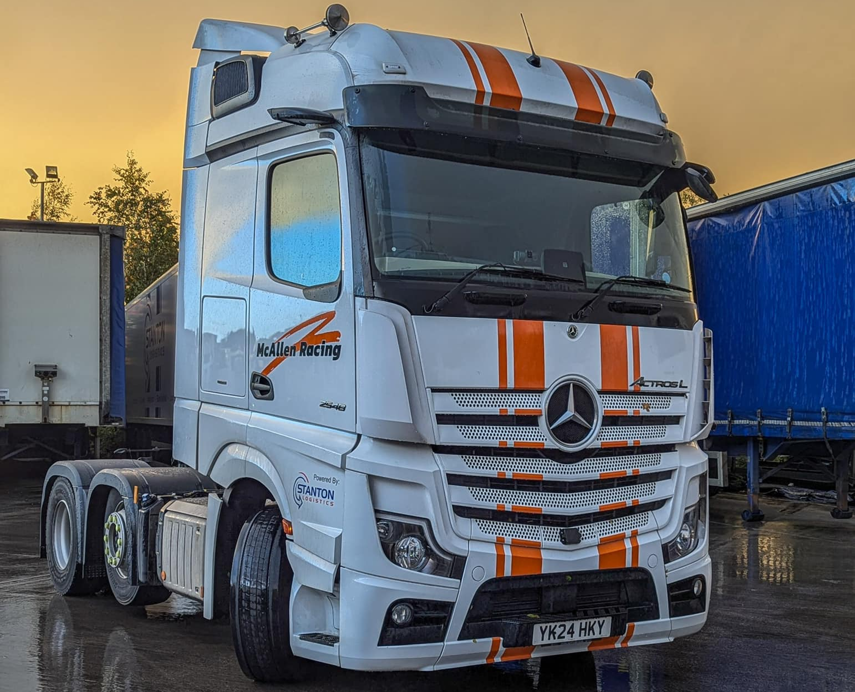 Caught in golden hour glow, this freshly branded McAllister Racing unit looked perfectly matched with the sky. It's not every day your fleet blends with the weather, but this orange-stripe beauty certainly stole the show. Another standout from our ongoing collaboration with Mercedes-Benz Trucks UK.